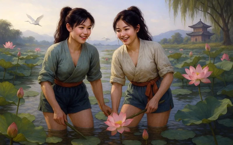 By the Ruoye Stream, lotus-gathering girls laugh and chat across the blooming flowers.