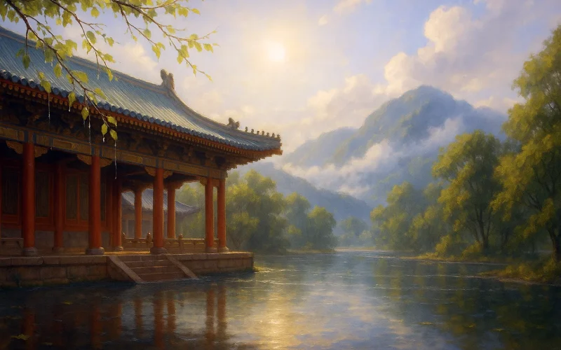 "The morning sun" establishes the temporal setting - dawn after rainfall, with the sun newly risen. "Palace halls" refers to buildings within the imperial court or gardens, carrying connotations of harmony. The rainwater filling the ponds reflects a refreshed atmosphere. This couplet focuses on light and water, portraying the clear and bright scene following the rain. Light and moisture complement each other, creating a tranquil yet vibrant ambiance.