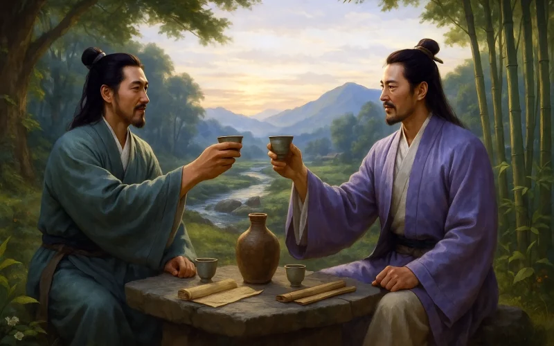 Tao highlights their convivial wine-drinking, embodying the unpretentious joy of their rural companionship.