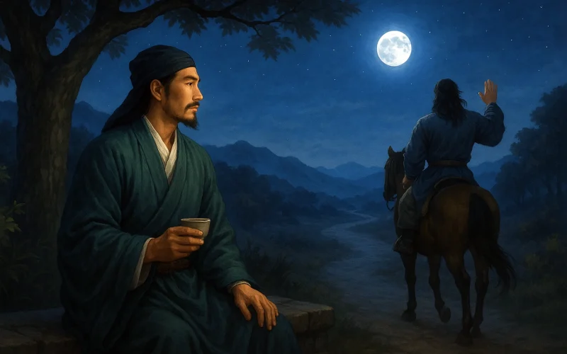 This couplet recalls the scene of bidding farewell under the moonlight the previous night, lamenting the unpredictability of life and the uncertainty of when they might reunite. The poet's use of "when" as a rhetorical question reflects his anxiety about the precariousness of official life and the unpredictability of the world, conveying profound emotion.