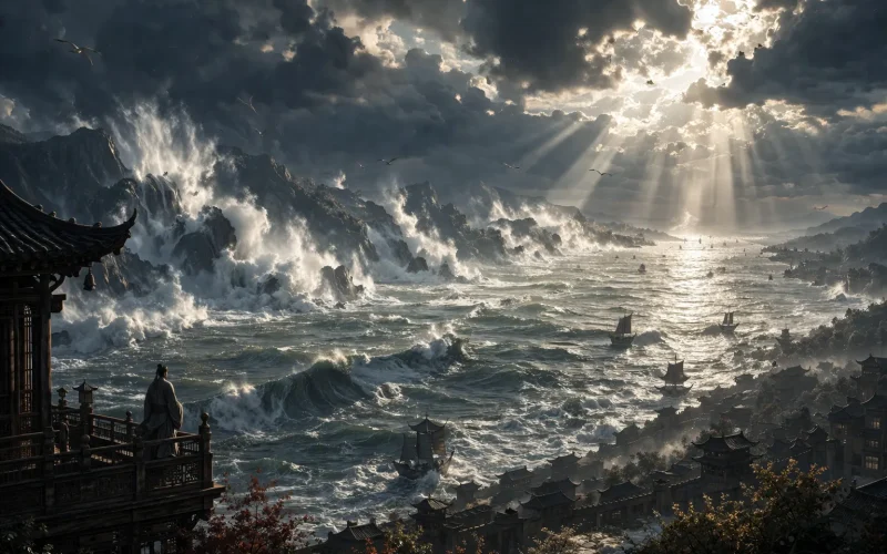 First, it lets us see "the mighty force of nature." That tide of "The fresh, strong sea wind blows with dragons’ breath, I hear; / The bright snow bursts from hills with thunder-drums’ roar" is one of the most majestic forces between heaven and earth. Before such power, humans are as insignificant as dust. It reminds us: Only by revering nature can we perceive our own limitations; only by placing ourselves within grandeur can we let go of daily trivialities.