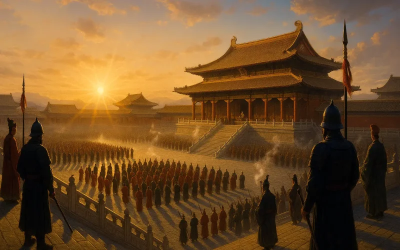 "Heaven's ninefold gates swing palace doors wide; / Ten thousand officials bow to crown and tide."