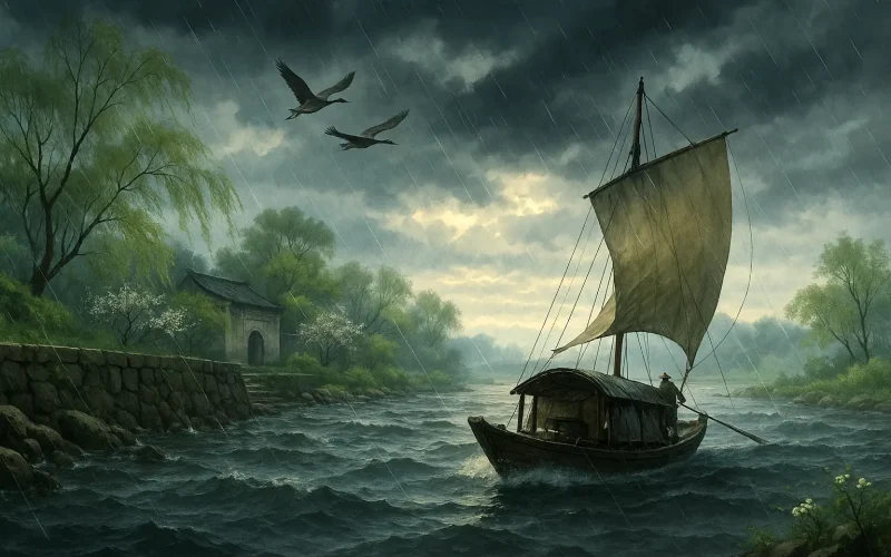 Particularly striking are the contrasting lines "wild geese cower under layered clouds" and "spring shores welcome the boat." One paints a sky heavy with melancholy, the other a water surface tinged with the first breath of spring. This interplay of the tangible and intangible, the distant and near, lends the poem an ethereal depth without descending into overt sentimentality.
