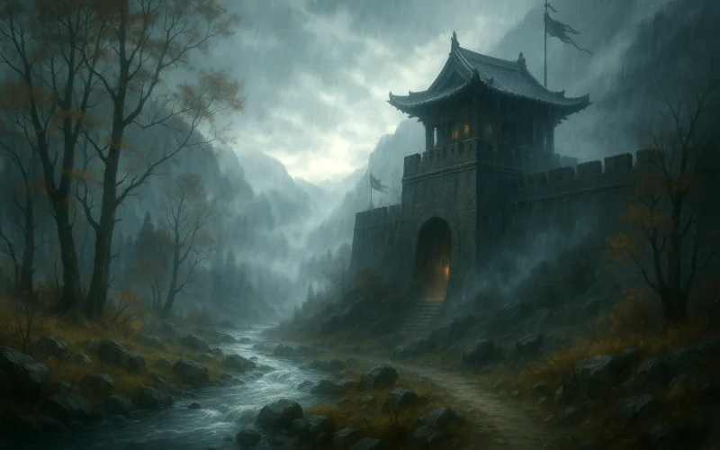 Mist-severed trees where mountain streams flow; / storm-winds breach the frontier town's brow.