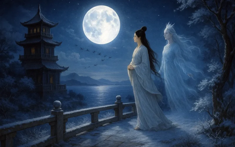 - Mythic Transfiguration: The seamless fusion of meteorological phenomena (frost/moonlight) with divine femininity (青女/素娥) creates layered symbolism