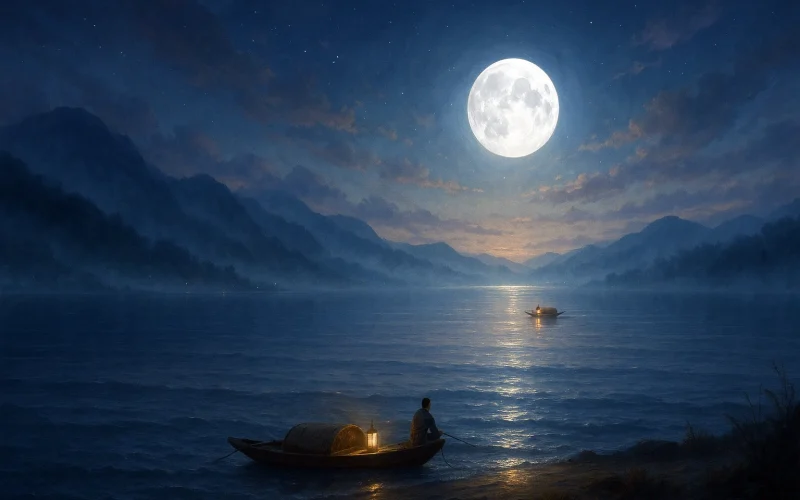 Amidst the splendor of nature, a traveler’s heart still harbors longing and rootlessness. Though Dongting’s autumn is picturesque, the poet’s gaze turns inward—not just to the external world, but to the emotions it stirs. Through images of fishing fires, merchant boats, and the autumn moon, we sense a yearning for home and an awareness of life’s transience. The poem teaches us to cherish the present, to embrace both the solitude and magnificence of life’s journey—much like that moon over Dongting, illuminating both the dust of the road and the quiet depths of the human heart.