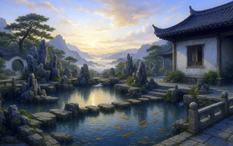 The first two couplets paint a scene where "the human world meets the divine." Fish swim freely in the pond, boats drift at will—an ideal realm where nature and humanity exist without barriers. This is more than mere scenery; it is a projection of the poet's soul, yearning to break free from worldly constraints and return to inner freedom.