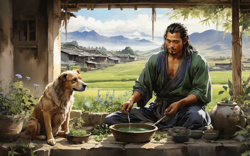 This is a quintessential recluse lyric, painting a tranquil mountain retreat through delicate imagery—"cultivating herbs," "closed doors," "dawn dreams," "fruit fragrance"—all reflecting the poet’s serene detachment from worldly clamor. Subtle longing for his friend Bao He permeates the verses, culminating in the poignant closing lines: "Fine days at the sky’s edge, / Melancholy lingers on purple orchids." The poem’s gentle yet lofty tone, understated yet elegant diction, blends Tao Yuanming’s pastoral charm with the High Tang literati’s leisurely spirit.