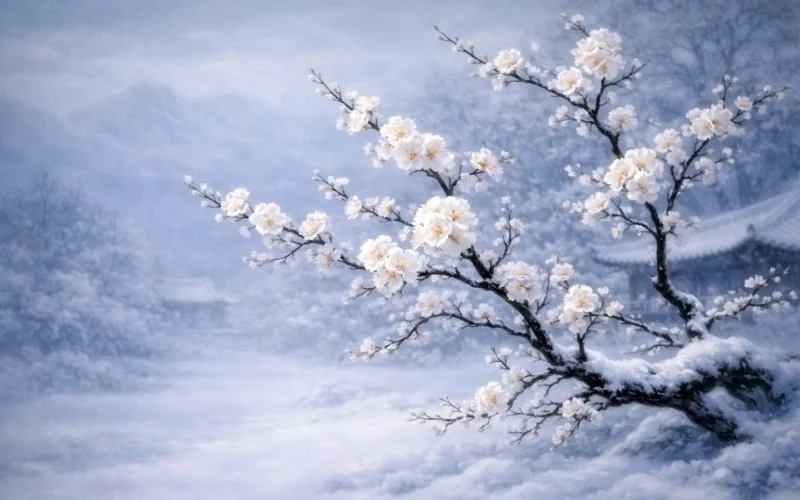 This poem is a renowned lyrical work on an object by the Mid-Tang poet Zhu Qingyu. Zhu Qingyu's poetry is known for its elegance and grace. He excels particularly in depicting female psychology with delicate brushstrokes, holding a unique position in Late Tang palace-style poetry. However, his lyrical poetry on objects also forms a distinctive style of its own. Zhu Qingyu's official career was not particularly successful; although he passed the Jinshi examination, he did not achieve prominence, and details of his later years are unknown. This poem uses the early mume (plum) blossom as a metaphor for the poet himself, expressing his pure and lofty aspiration to remain unstained by worldly dust. The mume blossom contends with snow and blooms in harsh winter, not vying with the hundred flowers for spring, just as the poet remains in a turbid world yet does not follow the crowd. Its "fragrance from dust is kept by the cold" mirrors the poet's inner nobility and self-integrity. He takes the mume blossom as a kindred spirit, and takes the pine and bamboo as companions of the same path, placing his ideal of character within the shared virtues of the "Three Friends of Winter."