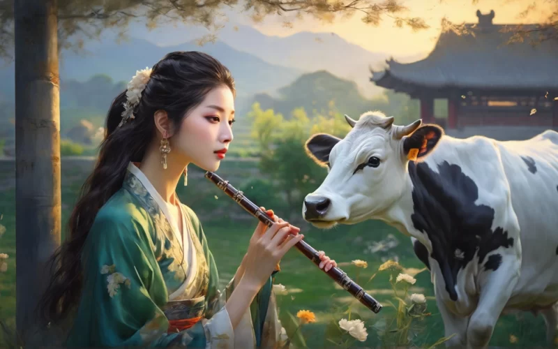 One day, he was playing the zither under the window, and the pleasant sound of the zither attracted many birds and bees. At that time, he looked through the window and saw a yellow cow grazing on the grass, so Gong Ming Yi got excited and went to the countryside with his zither. The spring breeze blew slowly, and the weeping willows moved gently. As soon as he reached the old cow, he quickly set up the zither, plucked the strings, and played the most elegant piece of music, "The Exercise of the Clear Horns," for the cow. However, the old cow was indifferent to grazing, and continued to eat grass with its head down.