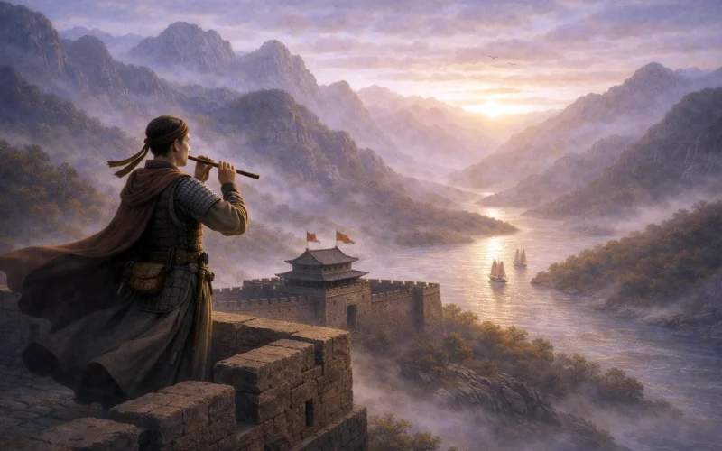 Liangzhou, une place forte stratégique du nord-ouest sous les Tang, était un carrefour entre les Plaines centrales et l'Ouest, et un lieu de garnison pour les troupes. À cette époque, l'administration des Tang sur l'Ouest était stable, et bien que l'empire prospère fût en paix, la vie aux frontières restait difficile. Le poète, traversant ces terres, voit le fleuve Jaune comme un ruban, s'élançant vers les nuages blancs ; une cité solitaire, enchâssée entre des montagnes vertigineuses. Dans l'immensité du ciel et de la terre, résonne la plainte mélancolique d'une flûte Qiang, jouant la mélodie du Saule brisé et son chagrin de séparation. Ce qui monte dans le cœur du poète n'est pas seulement l'émerveillement face au paysage grandiose, mais une profonde compassion pour le sort des soldats. Le soupir « le vent de printemps ne franchit pas la passe de Yumen » décrit à la fois le froid de la nature et la froideur des cœurs ; c'est à la fois un réalisme de l'amertume frontalière et une allusion voilée à l'ingratitude de la cour. En seulement vingt-huit caractères, il condense toute la puissance et le pathos, la splendeur et la désolation de la poésie de frontière de l'apogée des Tang, devenant un chant immortel.