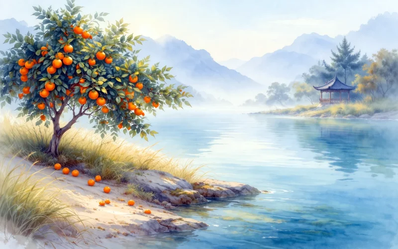 Et ce qui est le plus émouvant, c'est cette sérénité « sans plainte ni reproche » dans le poème. Le poète, exilé à Jingzhou, dans l'infortune, ne se plaint pas du ciel ni des hommes, ne devient pas misanthrope, il se compare seulement à l'oranger vermillon, écrit « Le destin ne dépend que des rencontres, / Son cycle est impossible à suivre », puis pose légèrement la question « Mais cet arbre n'aurait-il pas d'ombre ? ». Cette sérénité est la clarté après avoir traversé les vicissitudes, c'est aussi la liberté après avoir transcendé gains et pertes.