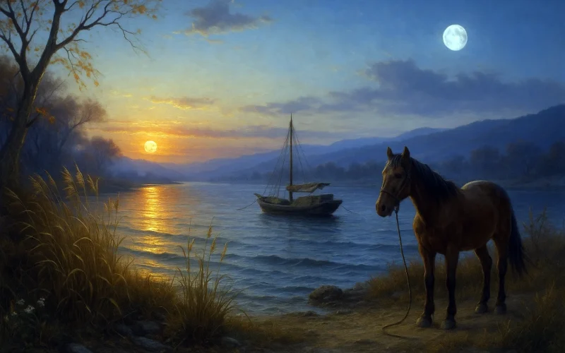 Ce poème mêle habilement métaphore et symbolisme, fusionnant des éléments naturels avec les émotions personnelles du poète. Le « nuage errant » et la « lune solitaire » traduisent visuellement sa solitude, tandis que la métaphore du « vieux cheval » affirme sa valeur malgré l’âge. Les sentiments du poète oscillent entre le désespoir et la résilience, aboutissant à une profonde expression de détermination et d’espoir.