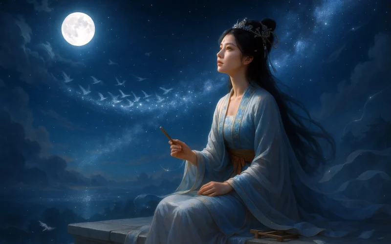 Ce poème s'inspire de la légende des Amants de la Voie lactée, où le Bouvier et la Tisserande se retrouvent une nuit par an, le septième jour du septième mois. Cette rencontre éphémère est devenue un thème classique évoquant l'amour, la nostalgie et la séparation. Shen Quanqi, poète de cour du début des Tang, maîtrise la tradition fastueuse de la poésie de cour mais y insuffle une émotion authentique. À travers la complainte céleste, il exprime les sentiments amoureux et les regrets des femmes terrestres, tout en reflétant sa propre mélancolie face à l'inconstance des retrouvailles et la fragilité des passions.