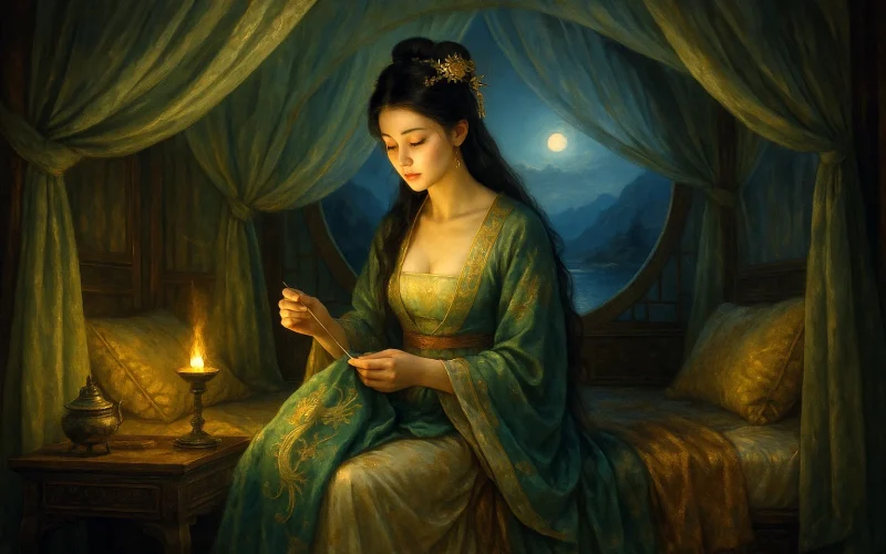 Le poète dépeint avec grâce la silhouette occupée de la femme dans la nuit. Les détails comme la "queue de phénix", la "soie parfumée" et les "motifs de jade" révèlent sa douceur et son habileté, tout en trahissant l'admiration profonde du poète.