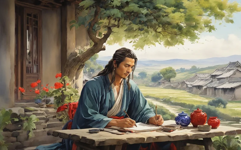 Le premier vers rappelle avec fierté son succès au examen provincial (解元), sommet de sa gloire officielle. "Libre et indompté" (猖披) marque la rupture avec les contraintes sociales, tandis que "regagner mon humble chaumière" scelle son retour à une vie simple. Ce contraste saisissant entre gloire passée et retrait présent révèle un rejet délibéré des compromissions du pouvoir.