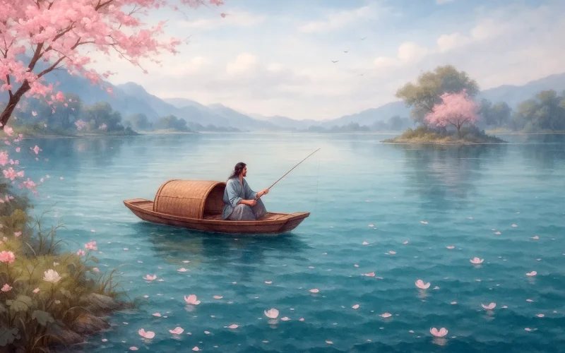 Ce poème, inspiré par une peinture, capture l'essence d'une vie simple en harmonie avec la nature. À travers l'image du pêcheur insouciant, le poète exprime son propre désir d'évasion. Le cadre printanier - brise, fleurs, lumière - intensifie l'impression de quiétude, tandis que la mention finale de la "liberté" révèle le véritable sujet du poème : la quête d'affranchissement spirituel.