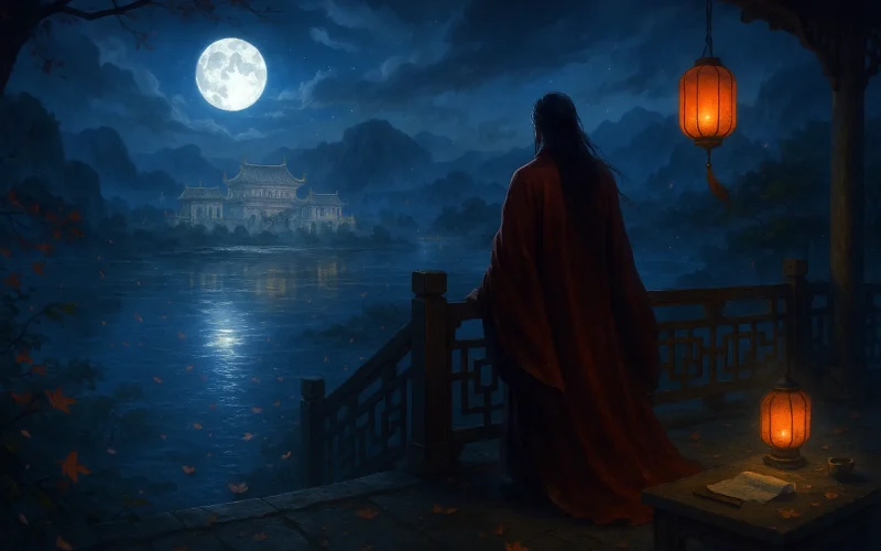 Le soleil décline, les fleurs baignent de brume ; La lune claire comme soie