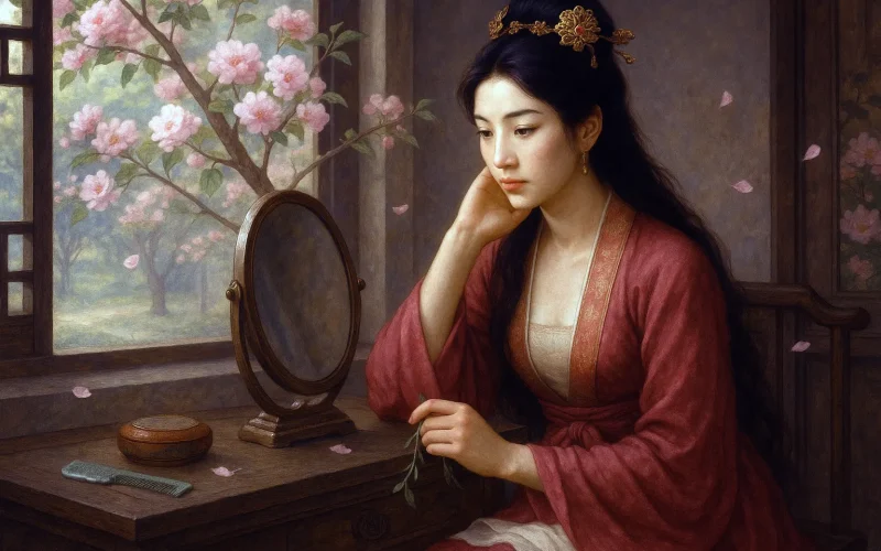 这一联写得含蓄又凄婉,女子清晨面对镜子梳妆,却泪下如注,“玉箸”意指晶莹的泪滴,贴合其身份与心境。最后一句以问句结尾,“春风知不知”,既似无奈自语,又似对自然的倾诉,将无人可解、无法言说的孤苦投向春风,情感顿时悠长无尽。对镜而泣的细节,也将她精心打扮、却无处投赠的孤寂展露无遗,动人至深。