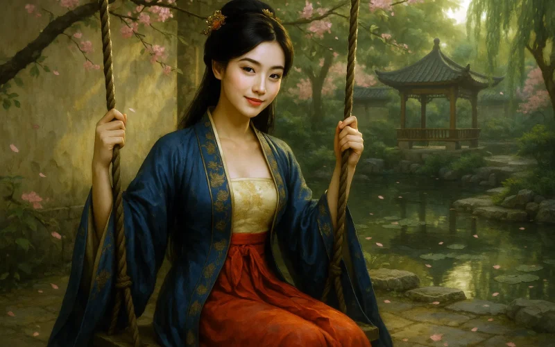 围墙里传来荡秋千的声音,墙外行人行走于小路之上,忽听墙内传来少女的笑语。笑声渐渐消失,四周一片寂静。多情之人却因此而郁结心中,被这无意的冷落惹得烦恼不堪。