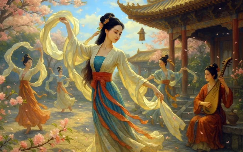 - 动静结合:既有舞袖飘动、歌声绕梁的动态,也有枝影摇曳、花香远送的静态,层次鲜明。
