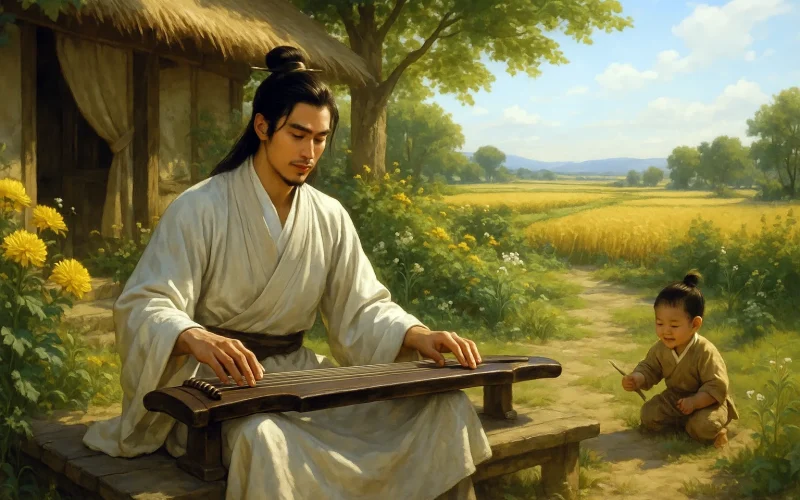 这首诗作于公元408年,陶渊明归隐田园已两年,时年44岁。脱离官场之后,他回归乡野生活,自耕自足,精神获得极大的释放和满足。这首诗正是他在盛夏时节写下的一篇田园生活写照,表达了他安贫乐道、乐天知命的处世态度,以及在自然与亲情中获得的深沉喜悦。
