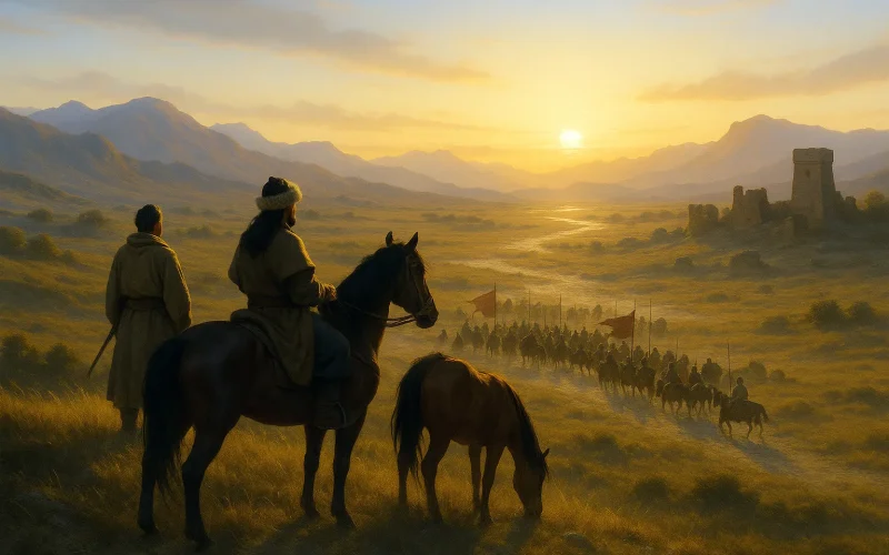 朝廷的使节衣袂飘扬,随着军旗而行,陇西的岔路边遍布荒凉的城池。