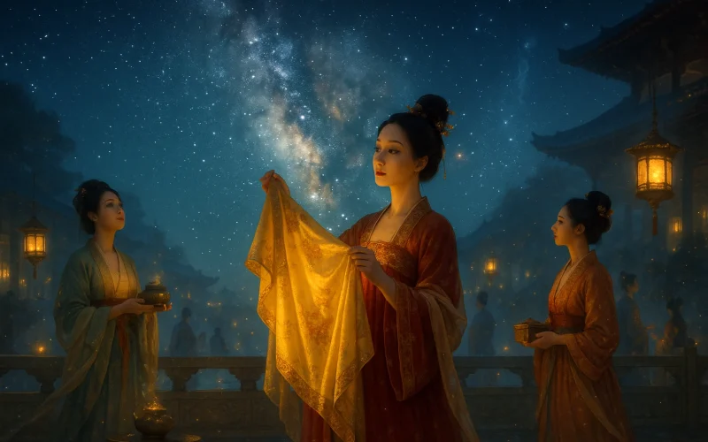 这首诗作于武则天或唐中宗时期。七夕节在唐代宫廷中被赋予极高的礼仪色彩,是女性节日的代表性盛典。宫中有“曝衣楼”,七夕之夜,宫女将罗绮衣裳陈列月下,象征祈福与求巧。然而沈佺期以诗纪事,不仅描写了这一节俗的繁华,更在奢侈艳丽的背后,寓讽于赞,以艳辞写盛景,用冷笔示警。