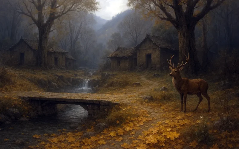 枯黄的落叶厚厚地铺在小桥上,村庄早已荒废,唯有几株古树还在风中伫立。