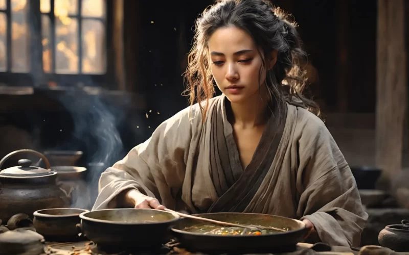 丈夫因战乱身亡,她独自守着简陋的茅屋,身穿粗麻布衣,鬓发枯焦。