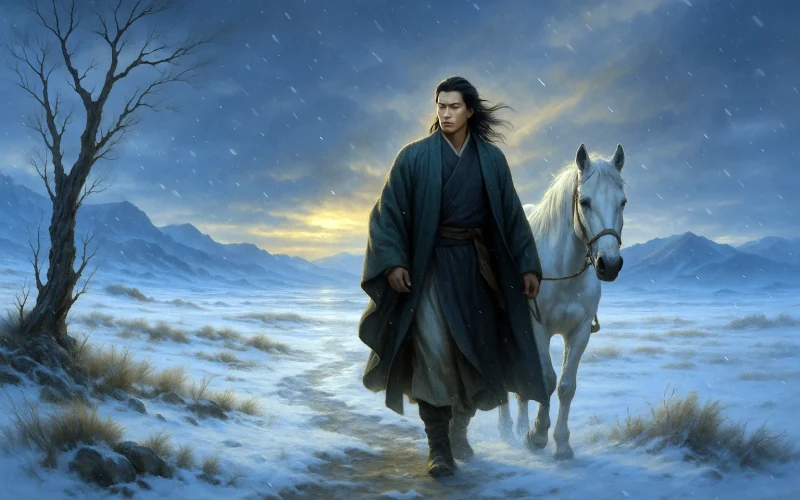 独自一人,踏着寒冷荒芜的千里路,骑着单马,穿着厚重的皮裘,在腊月寒冬里行进。