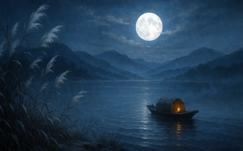 水乡夜晚,芦苇披霜,月光寒冷,山色一片苍茫。