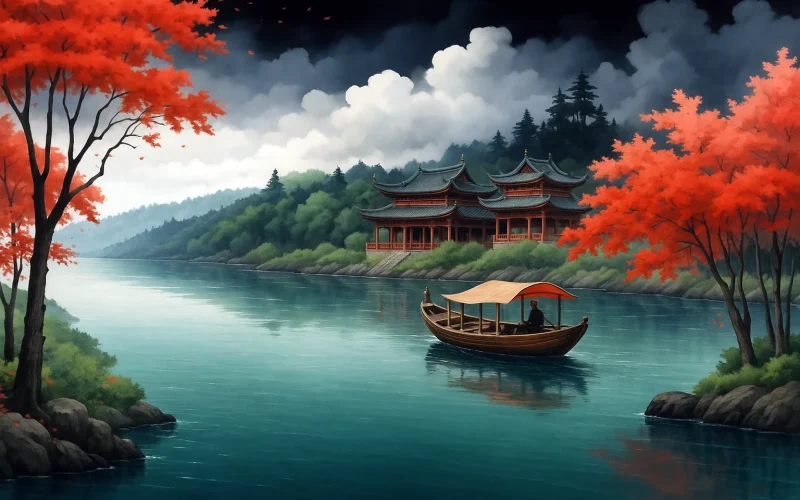 江河倒映着翠绿的湘竹,水边驿站环绕着青翠的枫树。
