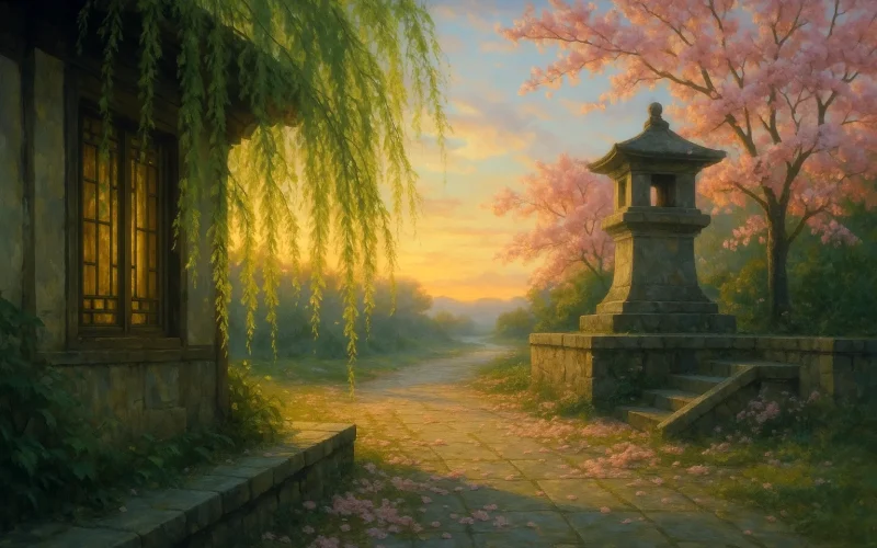 (在靖安里元稹的家中,窗前的柳树轻摇;而在驿台前,地面上落满了飘零的花瓣。)