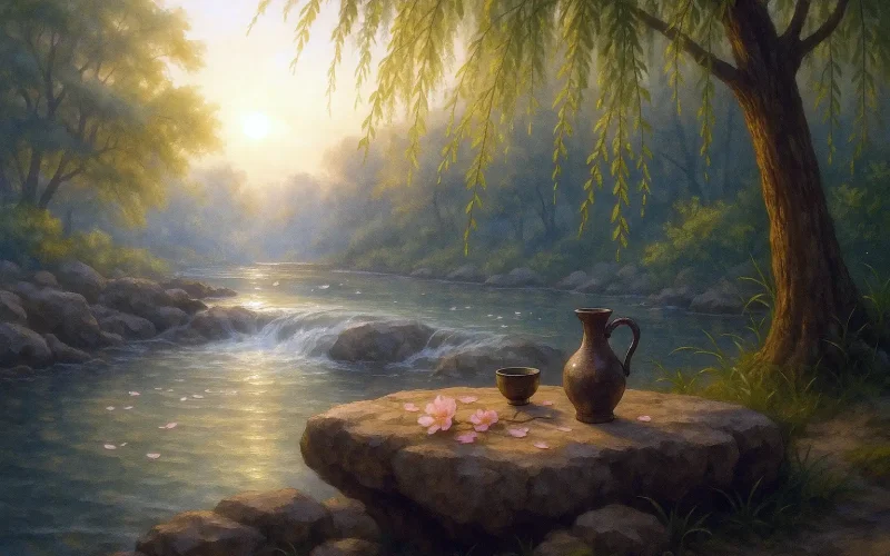 全诗虽仅二十八字,却完成了一次完整的审美体验与哲学升华。前两句致力于“造境”,诗人以画家的眼光选取最具代表性的物象(盘石、泉水、垂杨、酒杯),通过“临”“拂”两个动词勾勒其空间关系与动态交互,营造出一个既清幽静谧又亲切生动的独酌场景。这个场景是高度个人化、瞬间化的,却因描写的典型性而具备了普遍的感染力。后两句则致力于“问理”,诗人从静观转入冥思,通过一个关于春风意图的反诘,将外部景象内化为心灵的对话。落花入杯的刹那,成为自然向诗人传递信息的象征时刻,也是诗人悟入物我合一之境的契机。整首诗的结构呈现出“由静至动、由景入禅”的微妙进程:磐石之静,泉水之动;垂杨之拂,春风之吹;外在景象之闲适,内心诘问之深邃。王维将绘画的空间布局、诗歌的意境营造与禅宗的顿悟思维完美融合,在极简的形式中蕴藏了多层意蕴。