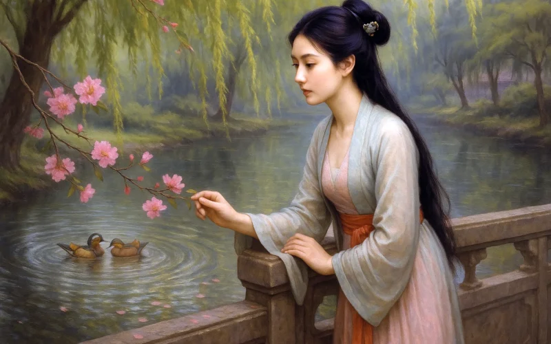 开篇以春风起兴,暗示女主人公心中情动。一个“皱”字,将她内心细腻的波澜生动地形象化。面对春日美景,她却无心欣赏,只能借逗引鸳鸯、揉杏花蕊来打发时光。这些看似漫不经心的小动作,实则流露出内心无尽的孤寂与哀愁,亦含有微妙的妒意:鸳鸯成双,而自己却孤身独处。