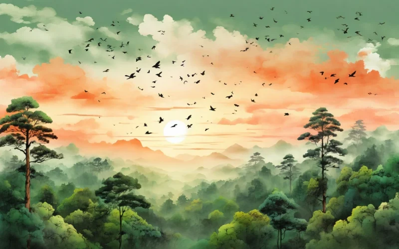 朝霞驱散了夜雾,众鸟成群飞翔。