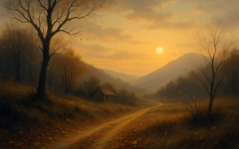 寒风吹拂干枯的枝条,落叶纷飞掩盖了长长的田间小路。