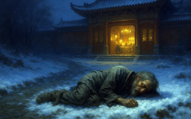 中段转向对社会现状的描绘。杜甫目睹当时社会的极端贫富差距,以“朱门酒肉臭,路有冻死骨”这一千古名句直击社会弊病。上句“朱门酒肉臭”写贵族豪门之家挥霍无度,宴席上的酒肉堆积到腐臭发馊;下句“路有冻死骨”则勾勒出贫苦百姓食不果腹、惨死街头的凄凉场景。两句强烈对比,揭露了唐王朝社会两极分化的现实,深刻批判了当权者的奢靡无度与对民生疾苦的漠视。