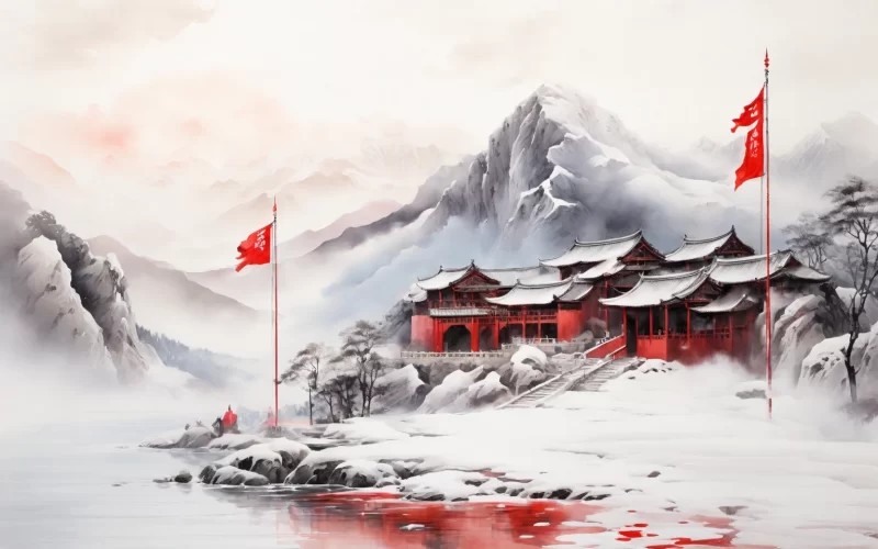 «Слышна флейта, но людей не видно, алый флаг взмывает в снега Тяньшаня.»