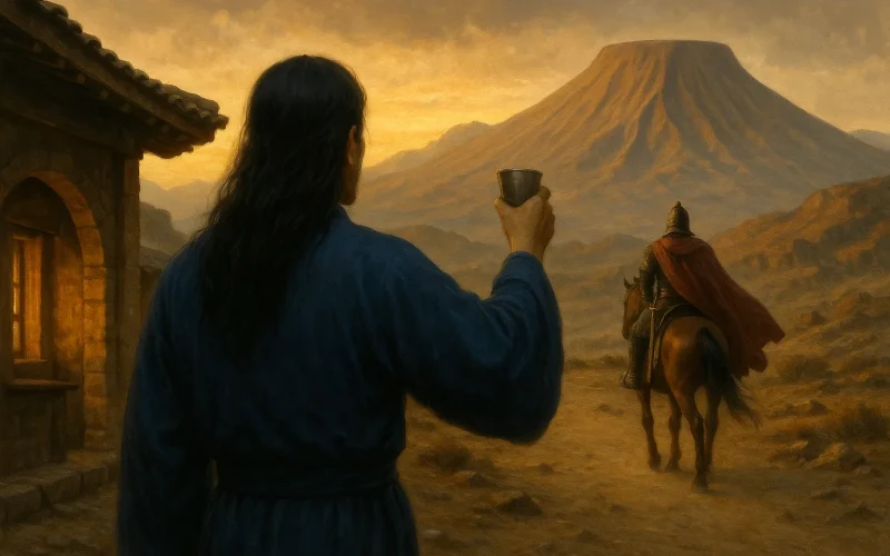 - Необычный выбор пейзажа – открытие через образ "огненной горы в мае" делает сцену незабываемой и мощной.